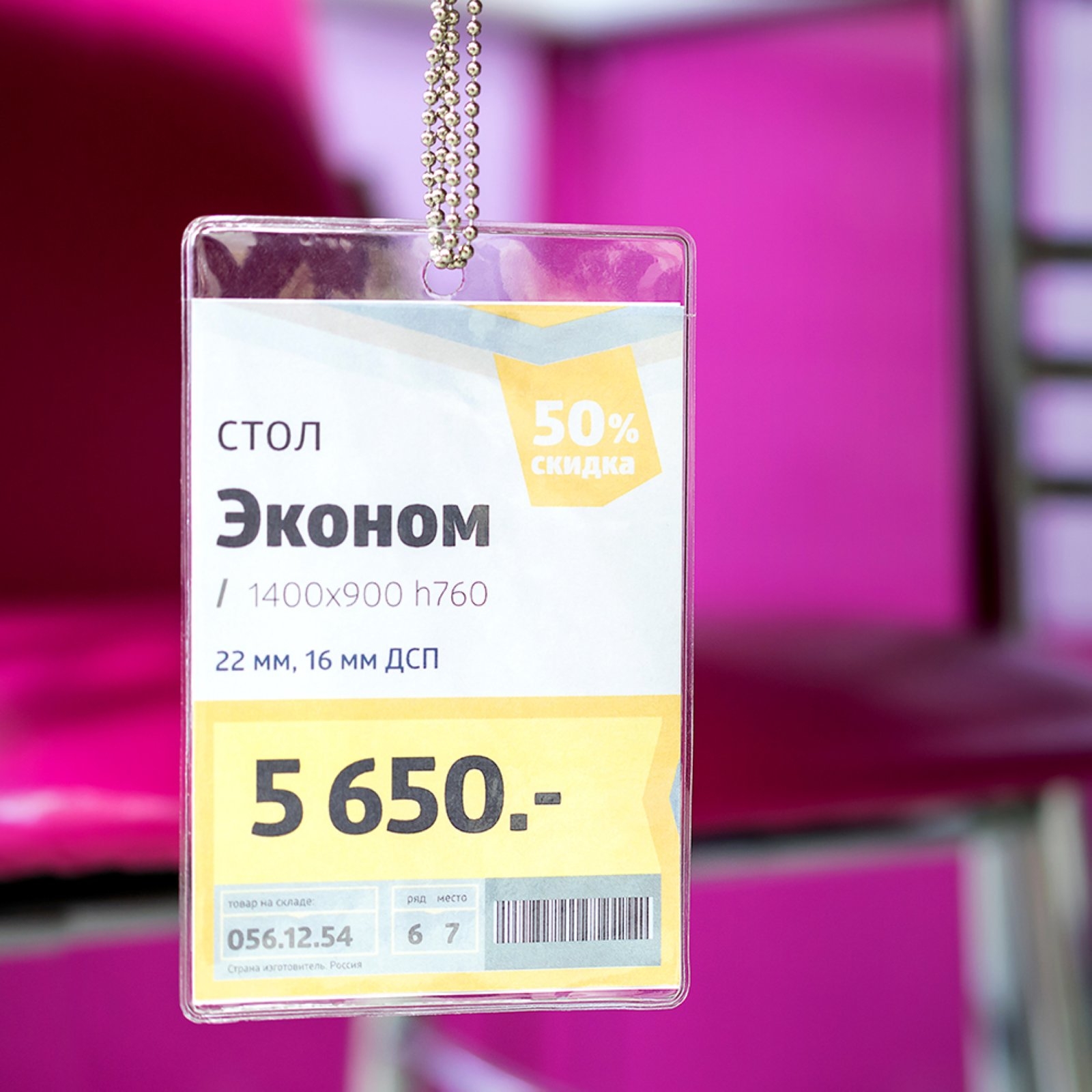 Имеет широкое применение, там где есть необходимость разместить больше информации о товаре. Одежда, кухонная посуда, светильники, люстры, и т.д. В верхней части имеет отверстие для подвешивания.