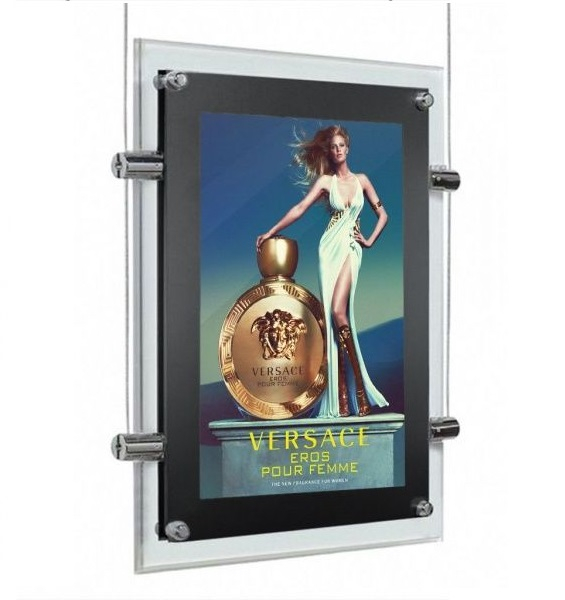 Световая панель подвесная «Кристалл» для вставки информации форматом А-1. Панель изготовлена из оргстекла, защитного поликарбоната с нанесением специальной рассеивающей сетки. Панель комплектуется блоком питания 26 ВТ, токопроводящим тросом, два троса по 2 метра. Так же в комплект входят потолочные крепления. Для транспортировки, панель упакована в индивидуальную упаковку.