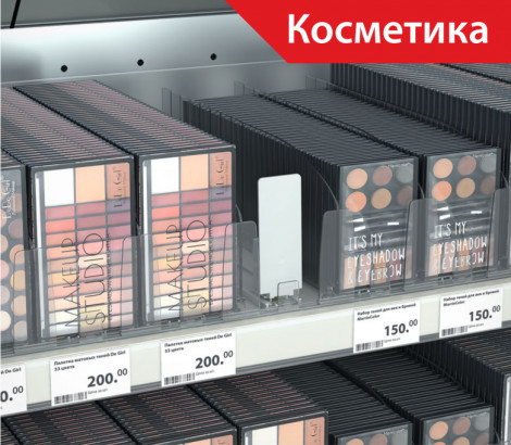 Толкатель FORTA MAGNA-1 — применяется для автоматической подачи товаров в устойчивой и неустойчивой упаковке к краю полки, подходит для продукции в твёрдой упаковке, от лёгкой до тяжёлой, в зависимости от выбранной силы пружины, идеально подходит для косметической и гигиенической продукции, коробок с конфетами и сырами. Монтируется на крепёжный T-профиль, имеет передний ограничитель, возможно использовать с любыми видами разделителей