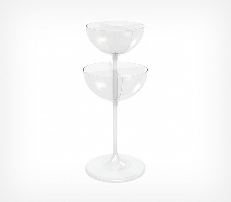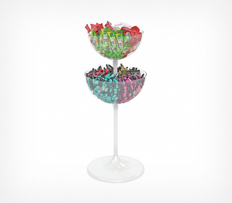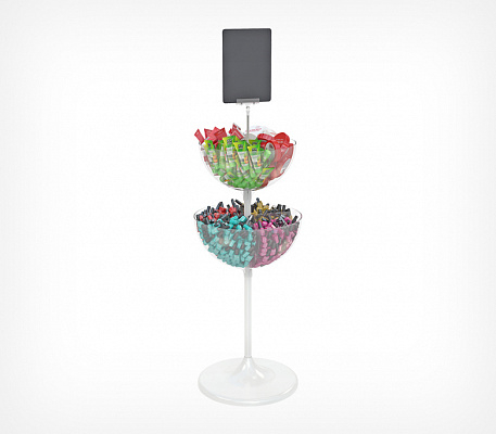 UNIBOWL-TOWER-DIV — двухуровневый дисплей для выкладки продовольственных и непродовольственных товаров в компактной упаковке. Состоит из двух чаш разных объёмов, что позволяет увеличивать объёмы выкладки и эффективность использования торговой площади.