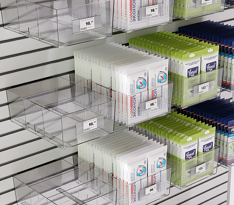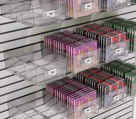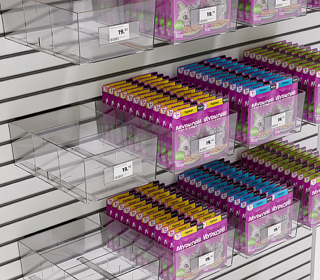 Рифленое дно предотвращает скольжение товара, а прозрачный пластик отлично презентует товар со всех сторон. На лицевой панели могут крепиться самоклеящиеся ценникодержатели. Выдерживает нагрузку до 4 кг.