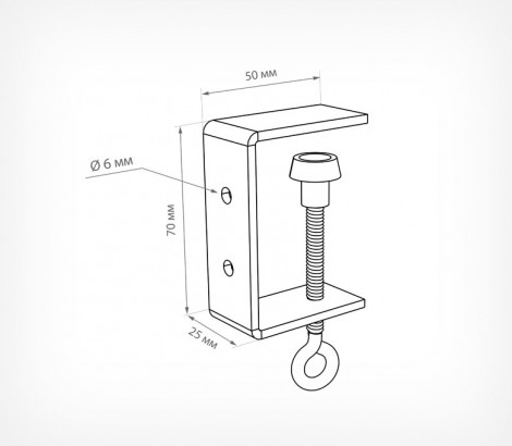Струбцина CLAMP HOLE с двумя отверстиями - предназначена для крепления к полкам толщиной до 40 мм рекламных конструкций, «паразитных» дисплеев, вывесок с металлическими, пластиковыми и картонными элементами. Рекламная конструкция фиксируется к струбцине с помощью винтов (не входят в комплект) через два отверстия диаметром 6 мм на вертикальной части струбцины.