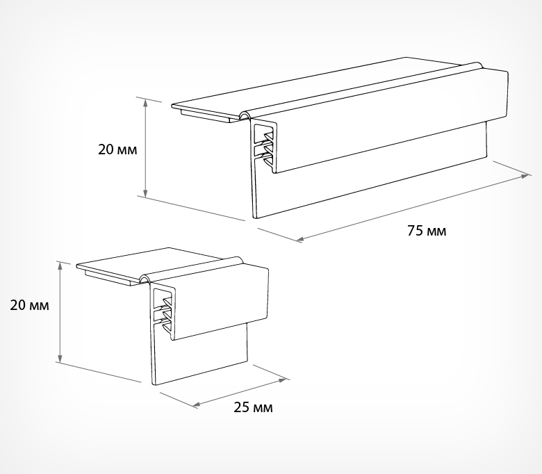 Может использоваться как ценникодержатель, особенно в случаях, когда невозможна установка на торце полки. Длина 25 мм. Прочное крепление без сверления, аккуратный внешний вид и улучшенная видимость за счёт наклонного угла делают SGFD-FLEX идеальным выбором для магазинов, выставок и торговых точек.