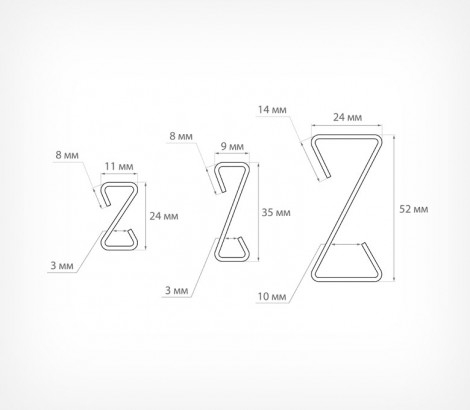 Металлический Z-образный крючок Z-HOOK предназначен для подвешивания различных рекламных и информационных носителей. Может использоваться с потолочными креплениями типа MB или MBR, CELING-CLIP, с плакатным профилем GRIPPER и подвесными системами UNITRACK, ECOTRACK, FLYTRACK и HIGHTRACK или в качестве соединителя нескольких подвесных конструкций. Оригинальная форма крючка Z-HOOK с острыми внутренними углами обеспечивает гарантированное подвешивание любой конструкции под углом 90 относительно пола, а также защищает от соскакивания носителя при случайном задевании во время эксплуатации. Толщина крючка — 2 мм.