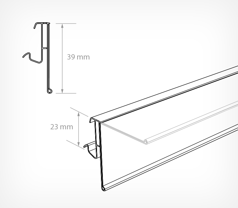 Идеально подходит для полок CEFLA и других типов полок с высотой посадочного места 23 мм. Обеспечивает надёжное крепление на краю полки. Размер лицевой части CFA39 под стандартный ценник высотой 39 мм.
