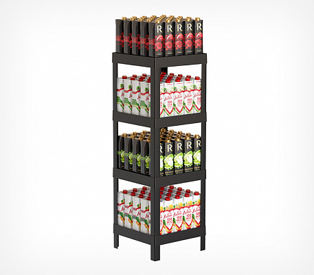 Компактный дисплей-стеллаж из пластика с четырьмя полками предоставляет удобное решение для организации дополнительной выкладки, проведения промо-акций или распродаж.